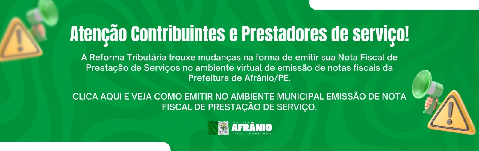 A Prefeitura de Afrânio, por meio do Setor de Tributos (Secretaria Municipal de Administração, Finanças e Segurança Pública), informa que, conforme a Reforma Tributária, passou a ser obrigatório informar…