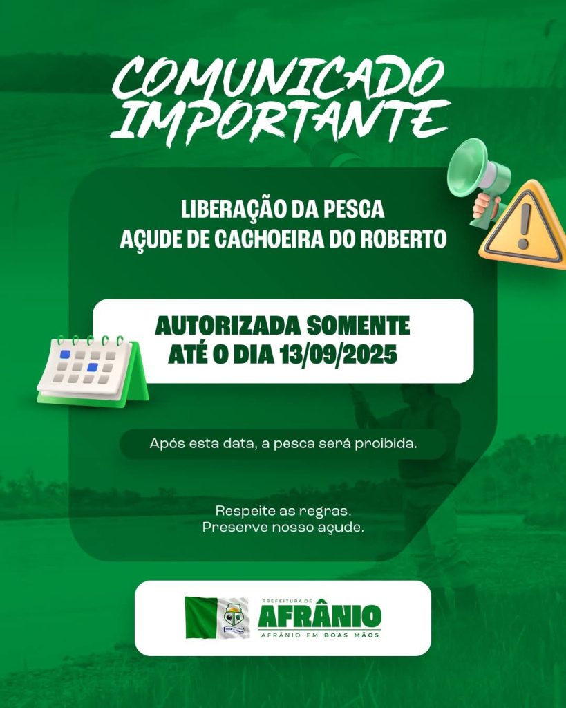 A pesca no Açude de Cachoeira do Roberto está liberada somente até o dia 13/09/2025.